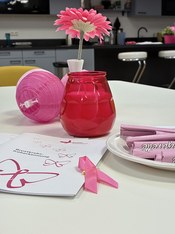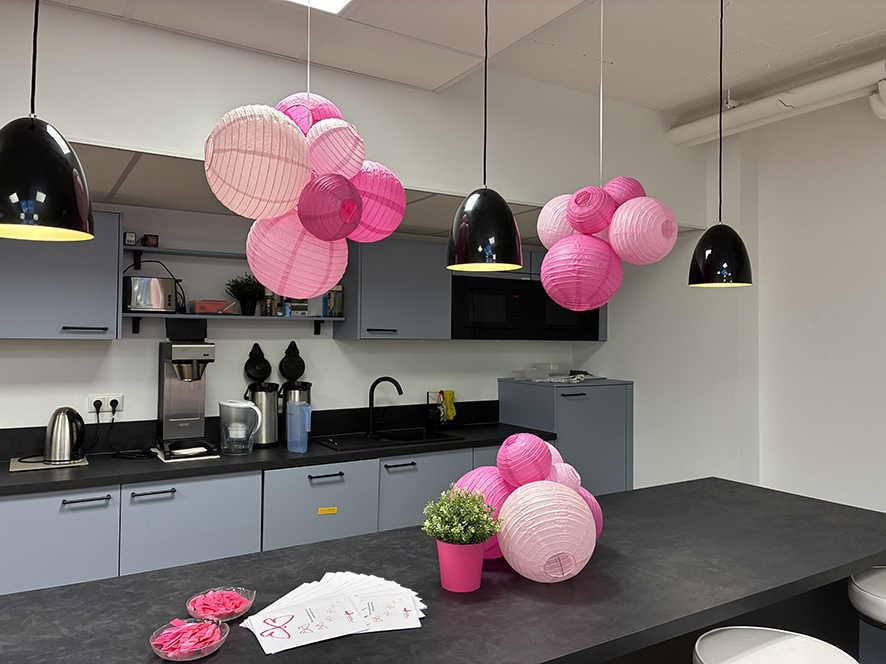 - 🎀 Die Pausenräume unserer verschiedenen Standorte wurden mit rosa Dekorationen geschmückt, die unseren geselligen Momenten eine warme und bedeutungsvolle Note verliehen.